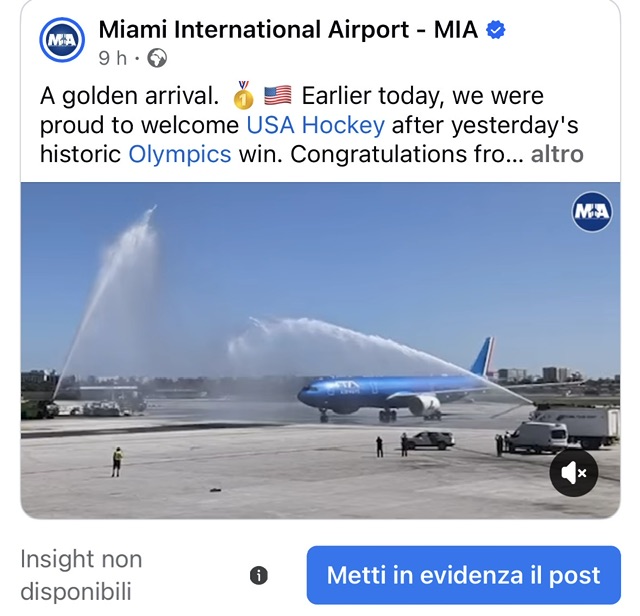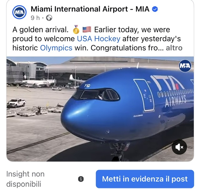 Ieri , la compagnia aerea italiana ITA Airways ha ricevuto un endirsement a costo zero, perchè e’ stata sotto i riflettori globali della audience americana con il ritorno a Miami del Team USA di hockey dopo i Winter Games di Milano Cortina 2026..