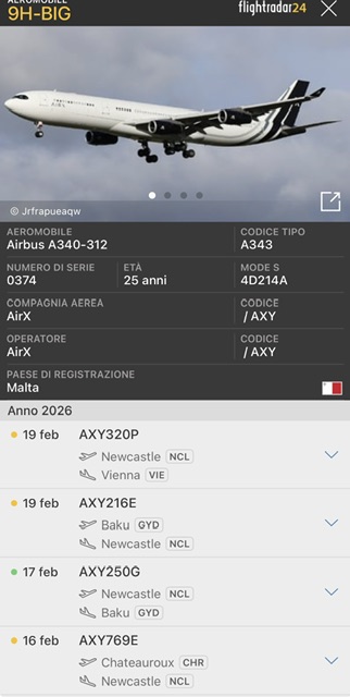 Tra il 17 ed il 19 febbraio ha operato due voli da Newcastle a Baku e ritorno. Poi si e’ riposizionato a Vienna.