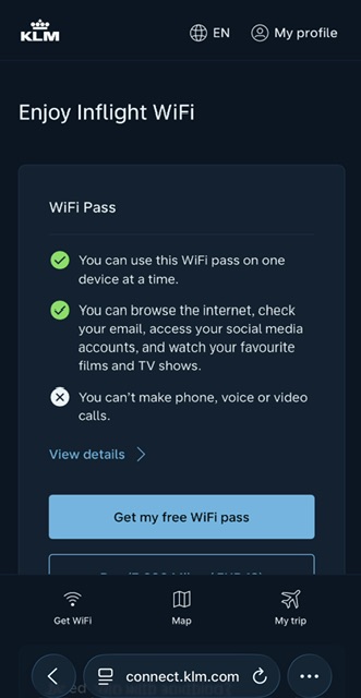 E’ da premettere che il WiFi veloce KLM non e’ ancora disponibile su tutti i velivoli di corto e medio raggio, ma e’ gia’ in funzione sui velivoli di nuova dotazione come Airbus A321neo e Embraer E195 E2, ma progressivamente lo sarà anche sugli altri. Noi lo abbiamo trovato proprio su un E195 E2 e un B737-800. Ad esempio non lo avevamo trovato su un Embraer E190 e un Boeing 737–900 Ieri lo abbiamo provato e vi diamo le nostre impressioni. Il sistema è anche disponibile su alcuni tipi di velivoli di Air France.