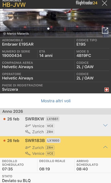 Il volo LX1660 da Zurigo per Venezia e’ atterrato da pochi minuti a Bologna suo aeroporto alternato. Il velivolo e’ un E195 Helvetic Airways con marche HB-JVW.