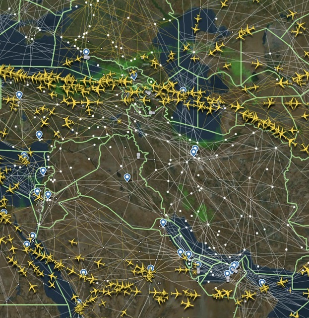 Come si vede a quasi un giorno dai combattimenti con aerei e missili tra Israele / USA e Iran gli apazi aerei inibiti sono quelli di diversi paesi del Medio Oriente.