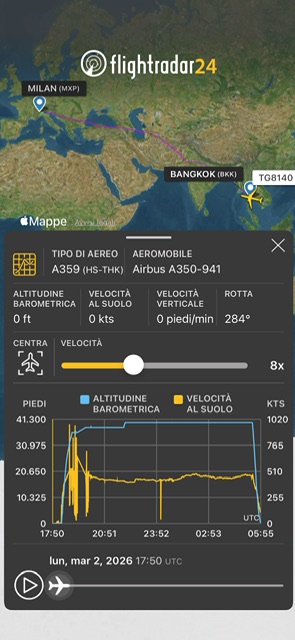 Quindi e’ stato reperito un aereo della Thai Airways che poteva trasportare all’incirca 300 persone per ritornare a casa. Il volo e’ partito alle 1:21 con A350-900 HS-THK ed e’ atterrato alle 6:54. Ora, certamente dovra’ rientrarea Bangkok.