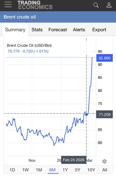 Come si vede dal grafico il 24 febbraio il costo del crudo era a poco piu’ di 71 dollari USA e il 6 era arrivato a 92 dollari USA. Non si conosce domani quale sara’ il prezzo. Invece ieri il Jet Fuel raffinato e’ arrivato a 131 dollari il barile. La bolletta per le compagnie aeree sara’ molto salata.