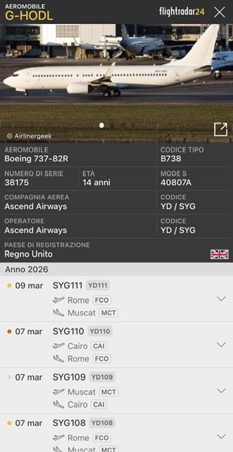 I voli sono stati operati il 4, 6 e 7 marzo. Questa mattina ripartira’ come YD111 verso Muscat.