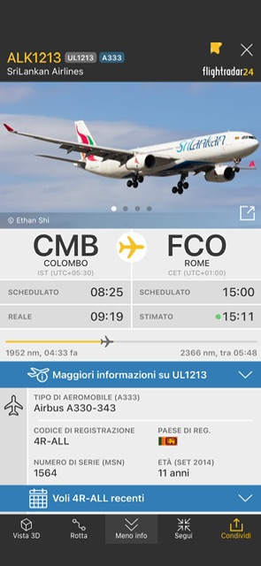 E’ al momento sull’Afghanistan il volo UL1213 della compagnia aerea di bandiera cingalese SriLankan per un volo di rimpatrio da Colombo a Roma Fiumicino. Il suo arrivo e’ previsto tra cinque ore e quarantotto minuti alle 15:48.