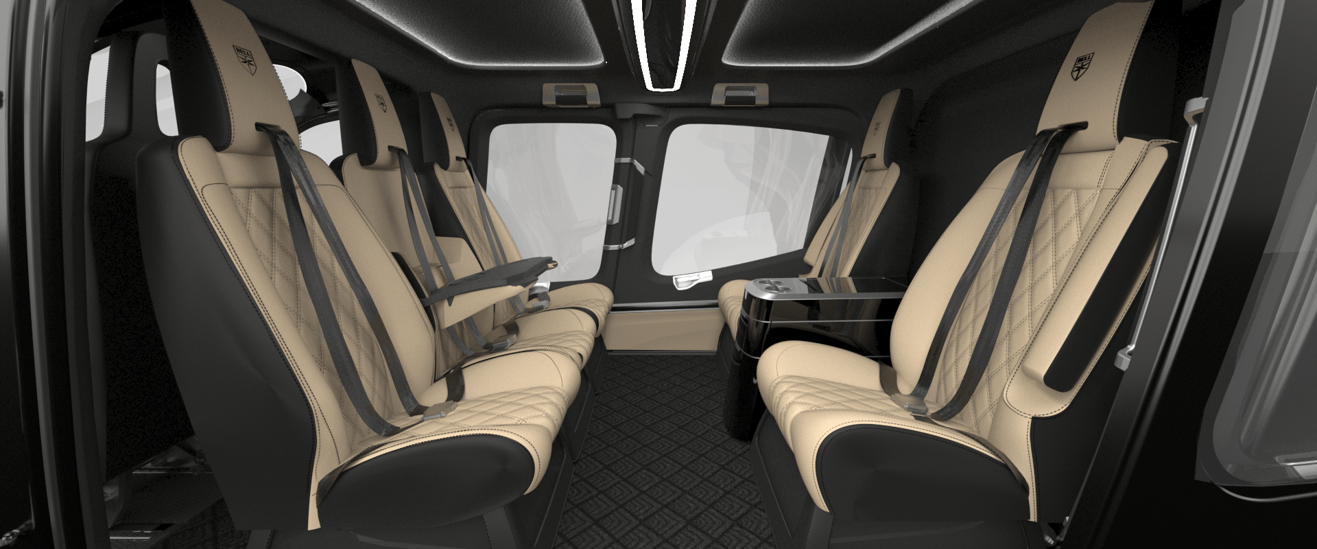 · Battitacco anodizzati: realizzati con precisione e con marchio Bell per un passaggio fluido all’interno dell’abitacolo. · Finiture di alta qualità: serrature e maniglie delle porte placcate in oro bianco, moquette in lana o pavimento in simil-legno, rivestimenti in pelle per i sedili, insonorizzazione aziendale e apertura automatica delle porte per l’equipaggio, la cabina e i vani bagagli.