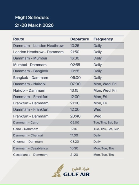 La situazione nel GcC e’ molto evolutiva e quindi e’ noto aspettarsi novità e in questo caso per Gulf Air c’e’ una piacevole novità. Nel suo network provvisorio da Dammam opererà su altre tre città tra Nord Africa e India nel periodo 21/28 marzo 2026.