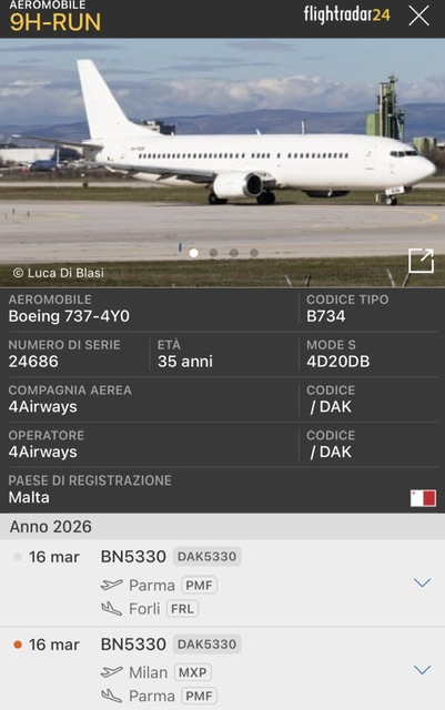 L’aereo, un B737-400 era previsto da Milano Malpensa a Parma, poi in partenza per Lamezia. Ma il rinvio della competizione per motivi di condimeteo avverse hanno forzato a sospendere la trasferta e anchd il charter. Il velivo ha quindi proseguito ferry per Forli.