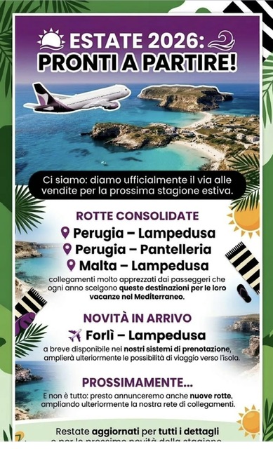 Attualmente ci sono già in vendita i primi voli Hellofly per la stagione estiva 2026 a partire dal 6 giugno da Perugia per Lampedusa e Pantelleria ogni sabato e fino a fine settembre.