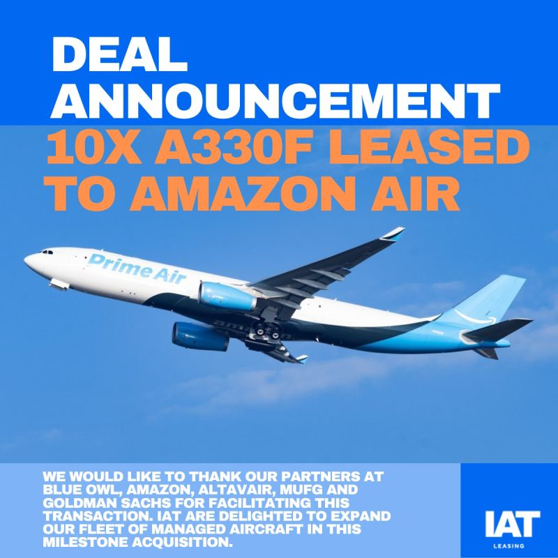 IAT Leasing Limited (“IAT”) è lieta di annunciare il proprio ruolo nell’organizzazione dell’acquisizione e della gestione continuativa del leasing di un portafoglio di 10 aeromobili Airbus A330F, attualmente in leasing ad Amazon Air e operati da Alaska Airlines. Gli aeromobili sono stati acquistati da fondi gestiti da ALTAVAIR e acquisiti per conto di fondi gestiti da Blue Owl Capital e finanziati da MUFG. IAT fornirà servizi continuativi di amministrazione del leasing e gestione degli asset.