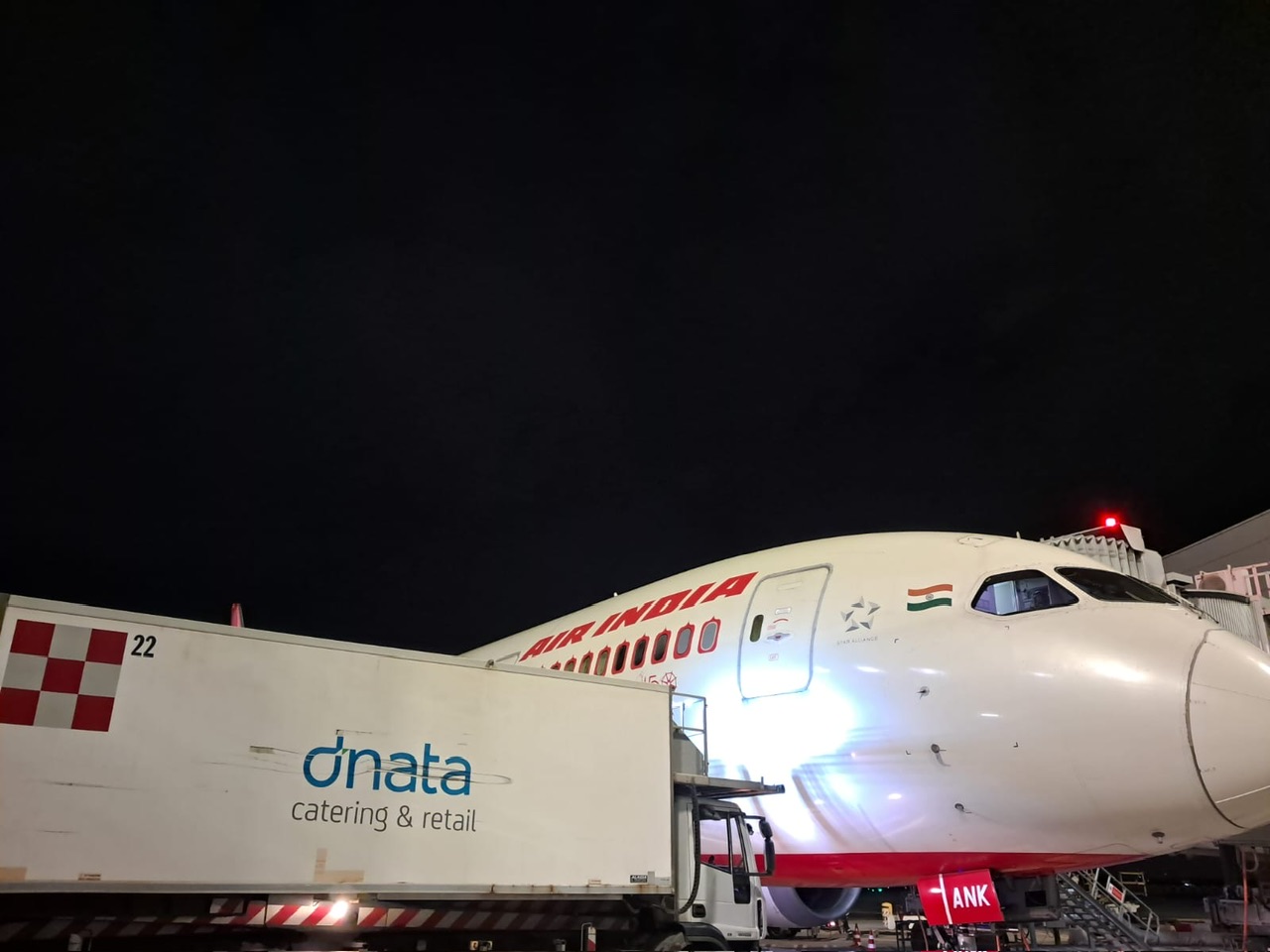 Il volo inaugurale AI123 e’ giunto alle 20 con due ore di ritardo sull’orario d’arrivo previsto. Il Boeing 787-8 VT-ANK.