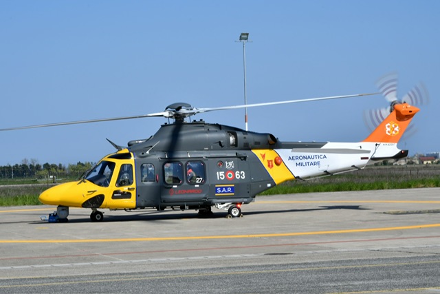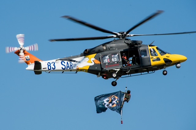 Come tradizione per questi eventi, non è mancato lo “special color”, ovvero un elicottero celebrativo appositamente dipinto e tenuto coperto fino all’ultimo per non svelare la sorpresa. I temi della colorazione sintezzano la storia e il compito del reparto: il pellicano che è l’emblema del Grupp. oltre alle bande gialle, arancioni e sfondo bianco che sono state delle macchine precedenti con la coda ornata da un 83 stilizzato e il classico stemma del 15° Stormo SAR, unità di appartenenza. E’ poi seguita una dimostrazione in volo delle capacità della macchina e recupero con verricello e un passaggio finale con la bandiera del Gruppo appesa all’HH 139 “special”.