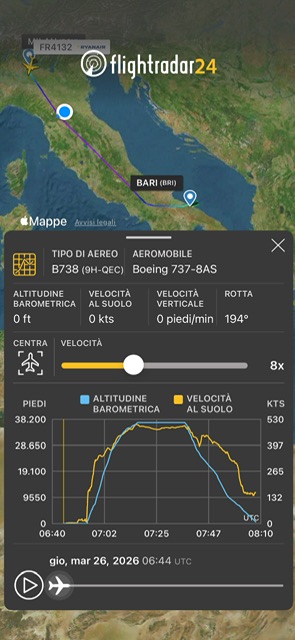 Alle 8:16 ha raggiunto la quota di crociera di FL370 che ha raggiunyo nell’area di Firenze e poi ha continuato fino ad iniziare la discesa sul Molise alle 8:37. Le fonti di stampa riportano cge ci sono stati fenomeni di turbolenza e di conseguenza dei passeggeri sono rimasti feriti.