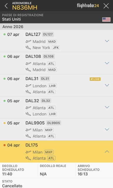 L’aereo Delta e’ partito il giorno dopo alle 11:09 come DL9905 per Atlanta.