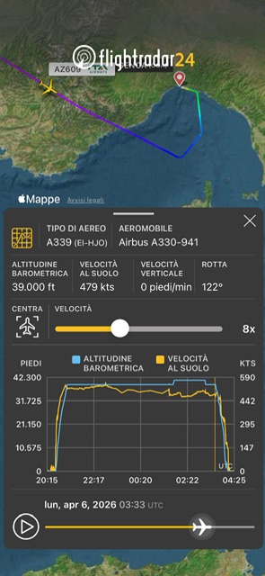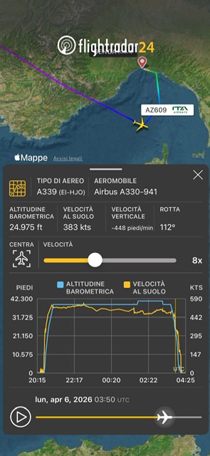 Quando era sulla Provenza a FL390 il volo ITA Airways AZ609 da New York per Roma a inioziato la dis esa da FL390 a lle 5:33 locali, poi ha prossguito verso il Mar Ligure e poi ha invertito alle 5:50 la rotta verso Genova a FL250. Ha toccato terra al Cristoforo Colomboalle 6:09. Non siamo a conoscenza della natura del problema, ma e’ presumibile una ragione sanitaria. L’aereo era previsto in ripartenza per Roma alle 7:25 sempre come AZ609.