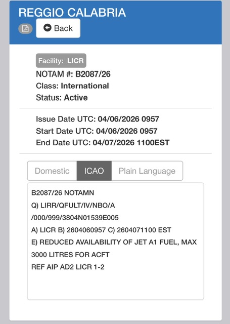 A Pescara c’e’ solo disponibile una autorifornitrice da 20000 litri. Il NOTAM B2080/26 e’ stato emesso alle 22:57 di sabato 4 aprile 2026, le 20:57Z ed e’ valido fino alle 10Z del 8-4-2026 ovvero le 12 locali .
