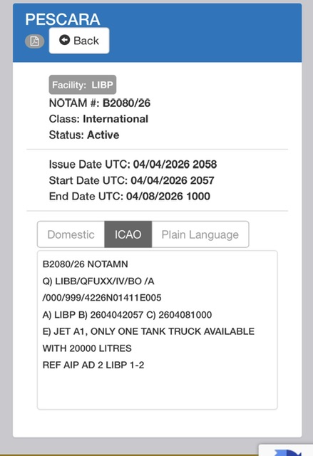 A Pescara c’e’ solo disponibile una autorifornitrice da 20000 litri. Il NOTAM B2080/26 e’ stato emesso alle 22:57 di sabato 4 aprile 2026, le 20:57Z ed e’ valido fino alle 10Z del 8-4-2026 ovvero le 12 locali .