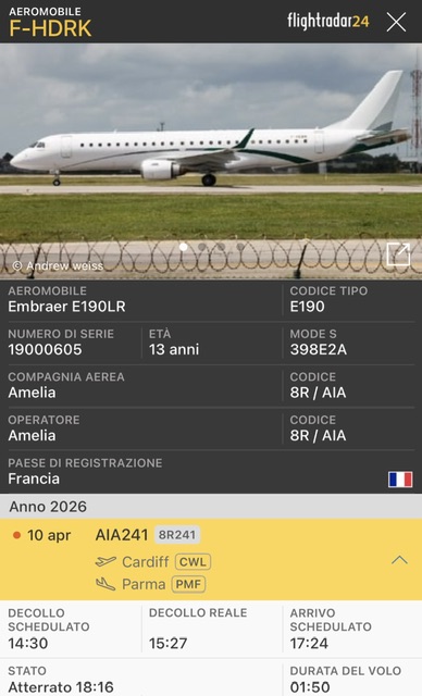 Ieri da Cardiff e’ giunto un Embraer E190 F-HDRK della compagnia aerea francese Amelia. A Cardiff era arrivato vuoto da Parigi Le Bourget.