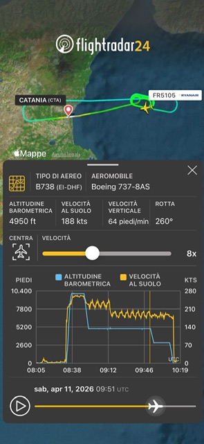 Qualcosa stamani non ha funzionato sul volo FR5105 decollato alle 10:33 da Catania per Atene, ma quando cinque minuti dopo ha raggiunto la quota di FL100 ha fermato la salita e poi dieci minuti dopo e’ di nuovo sceso a 5000 piedi alle 10:54 e vi e’ rimasto con tantte holding sul Golfo di Catania fino alle 11:51. Alle 11;55 e’ sceso a 3000 piedi per 15 minuti. L’atterraggio e’ stato alle 12:14. L’aereo era in precedenza giunto da Atene dove e’ di base.
