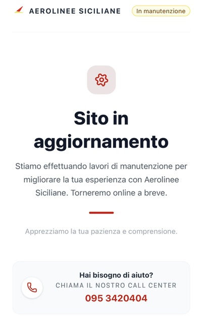 Da qualche giorno, ci viene segnalato da qualche lettore, il sito di Aerolinee Siciliane e’ cosi, come vedere, in manutenzione.
