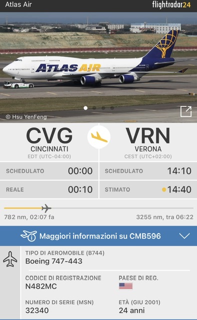 Alle 14:40 di oggi e’ previsto l’arrivo a Verona di questo Boeing 747-443 Atlas Air non cargo, ma passeggeri con le marche N482MC. E’ decollato da qualche ora da Cincinnati.