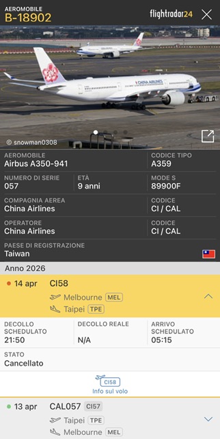 L’A350-900 con le marche B-18902 era in progress per essere approntato per la successiva partenza da Melbourne con destinazione Taipei come CI58. Ma con questo danno tutto e’ stato reso vano e l’aereo e’ non aeronavigabile. Il volo di conseguenza e’ stato cancellato.
