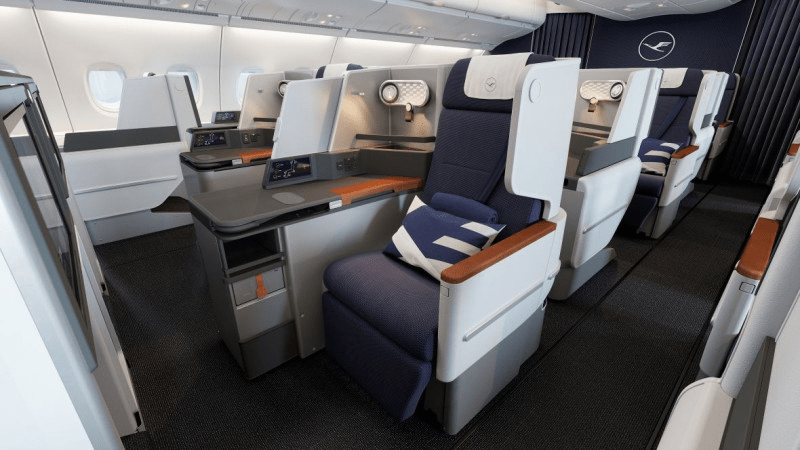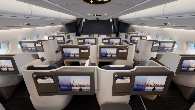 Premium XXL: Lufthansa sta rinnovando i suoi otto A380 e installando una Business Class completamente nuova sul suo aereo più grande. In futuro, la Business Class sull’A380 offrirà ancora più comfort e privacy a un nuovo livello premium. Le nuove poltrone Thompson hanno una larghezza di 58 cm, una lunghezza del letto di almeno due metri e divisori flessibili, rendendo questa la Business Class più confortevole mai vista su un A380. Ciascuno dei 68 posti è direttamente accessibile dal corridoio.