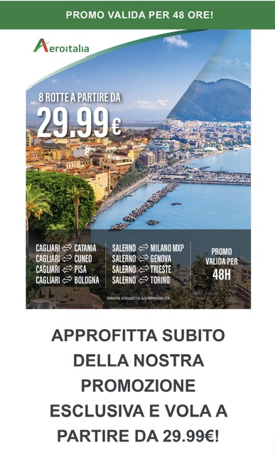 Da oggi a tutto domani c’e’ la possibilità di comprare biglietti a tariffe scontate su 8 rotte Aeroitalia , 4 da Cagliari e 4 da Salerno. I bigliei aerei sono a partire da 29,99€ sola andata e tasse comprese per volare dal 5 maggio al 30 giugno.