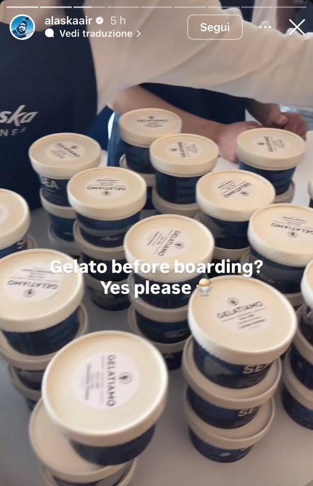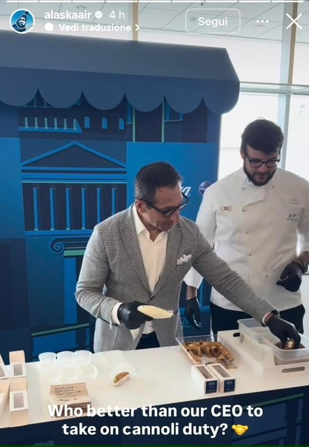 E’ stato molto pratico il fuori programma dove il CEO Alaska Ben Minicucci, al buffet del gate N16 si e’ messo a preparare i cannoli da offrire ai passeggeri del primo volo AS180 da Seattle per Roma.