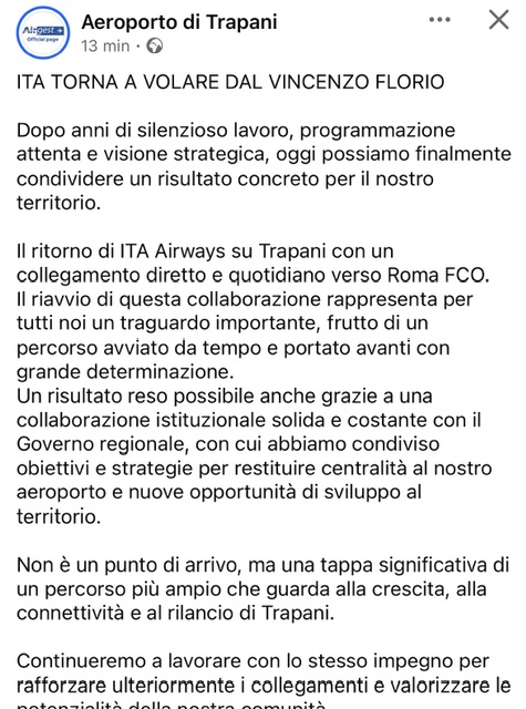 Sempre l’aeroporto siciliano scrive “con un volo quotidiano per Roma Fiumicino frutto di anni di lavoro strategico e collaborazione con la Regione Siciliana. Un traguardo importante, ma solouna tappa verso la crescita ed il rilancio del territorio”.